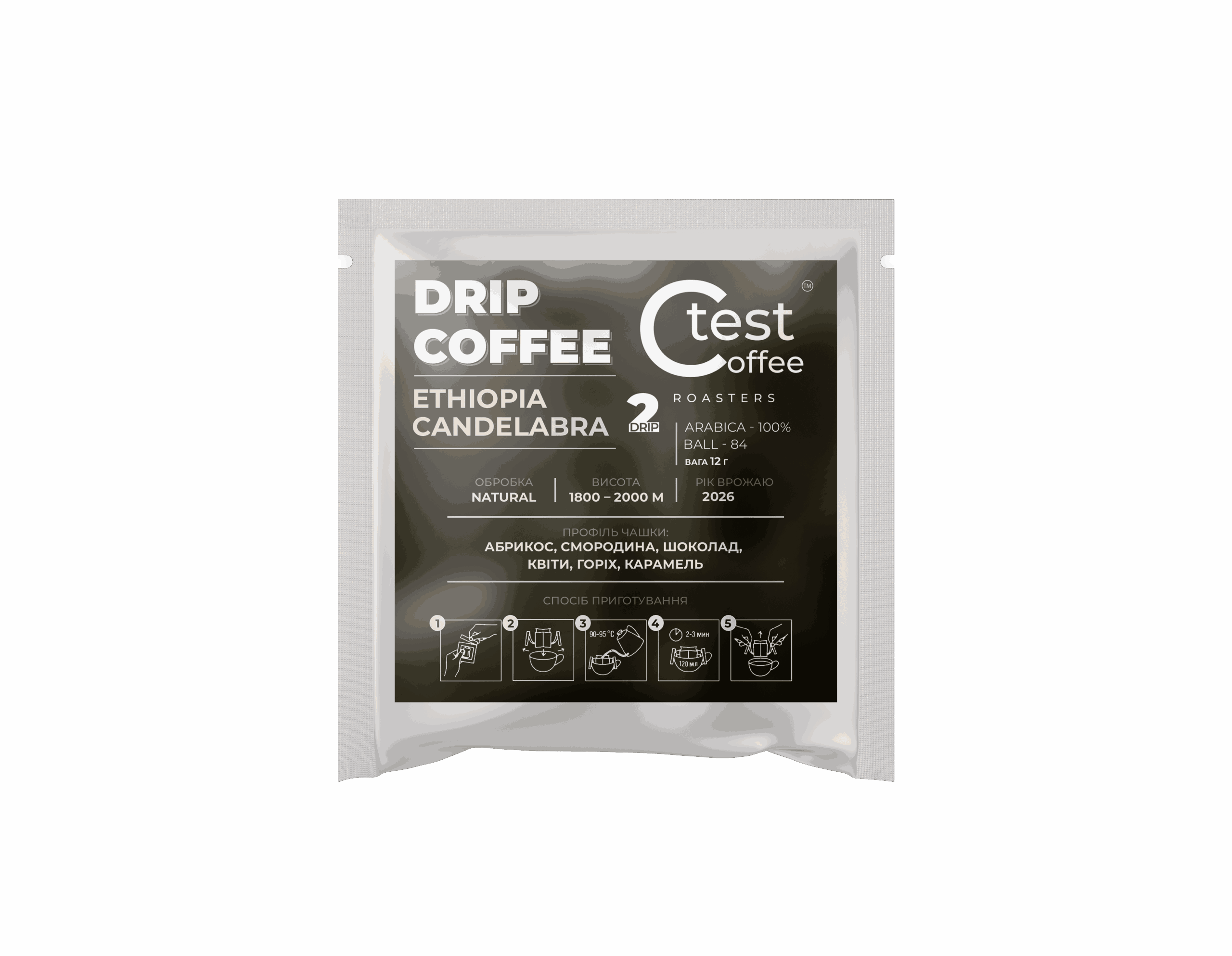 Дріп-кава Ethiopia Candelabra — 2 порції по 12 г. 100% арабіка з Ефіопії, обробка Natural, яскравий фруктово-шоколадний профіль із квітковими нотами.