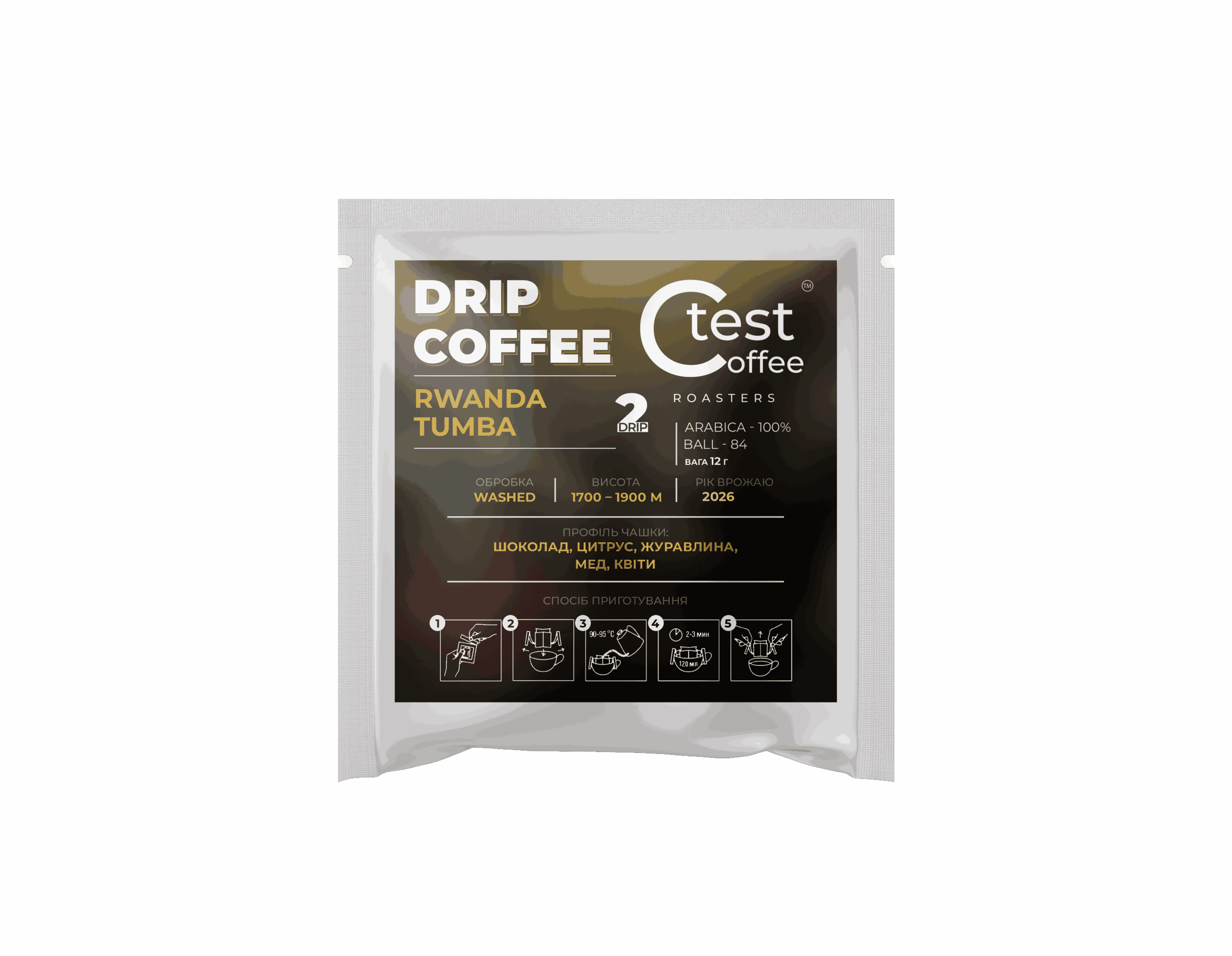 Збалансована дріп-кава з Руанди (100% арабіка): 2 шт. по 12 г, washed-обробка, 1700–1900 м. Смак: шоколад, цитрус, журавлина, мед, квіткові ноти. Cup score 84.