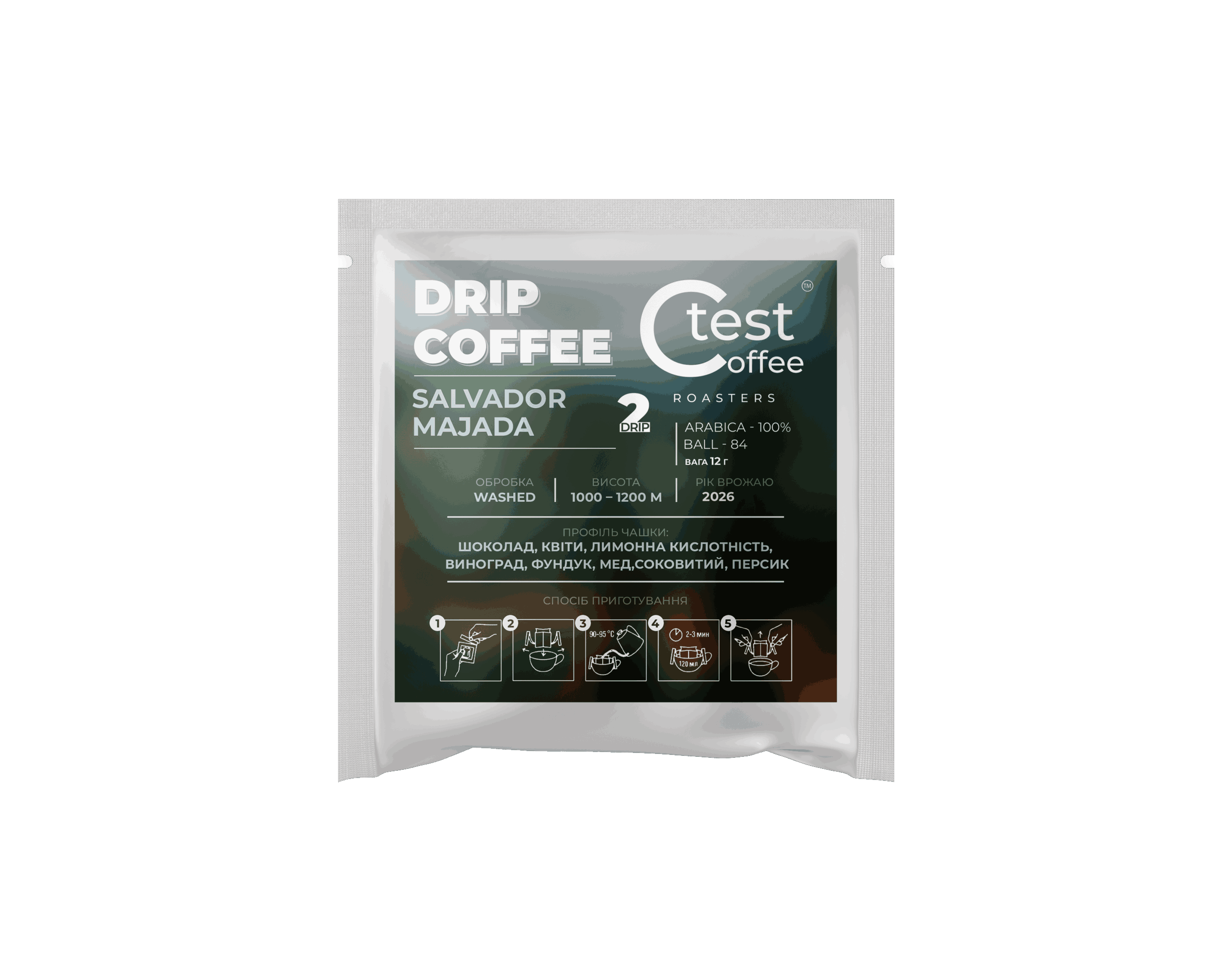 Specialty дріп-кава з Сальвадору (100% арабіка): 2 шт. по 12 г, washed-обробка, 1000–1200 м. Смак: шоколад, виноград, персик, мед, квіткові ноти. Cup score 84.